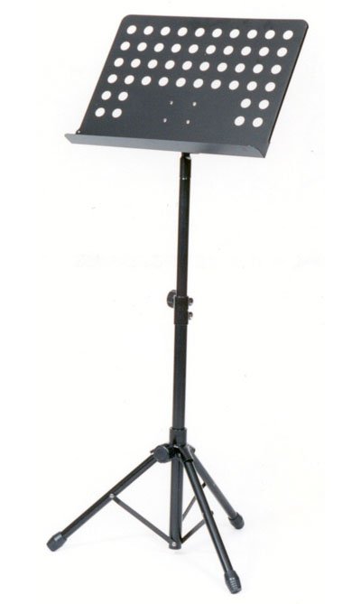 Tubular steel construction. Cast metal leg housing and height adjustment bracket. Large ABS locking mechanism. Perforated steel music desk 34H x 48W cm with adjustable desk angle. Height adjustable from 64-114cm.