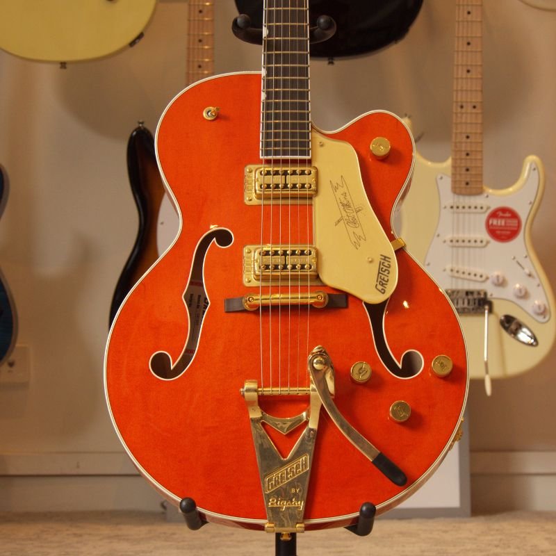 Meet your next show-stopping sidekick: a Gretsch G6120T-59 Vintage Select Edition ’59 Chet Atkins Hollow Body with Bigsby, glowing in that iconic Vintage Orange Stain lacquer. Lightly played and lovingly kept, it delivers all the retro swagger you want — TV Jones® Filter’Trons, rocking-bar bridge, and Bigsby vibrato — with just the faintest signs of real-world use. If you’re after shimmering rockabilly snap, smooth vintage warmth, and a guitar that turns heads before you even plug it in, this beauty is ready to jump right back onstage.