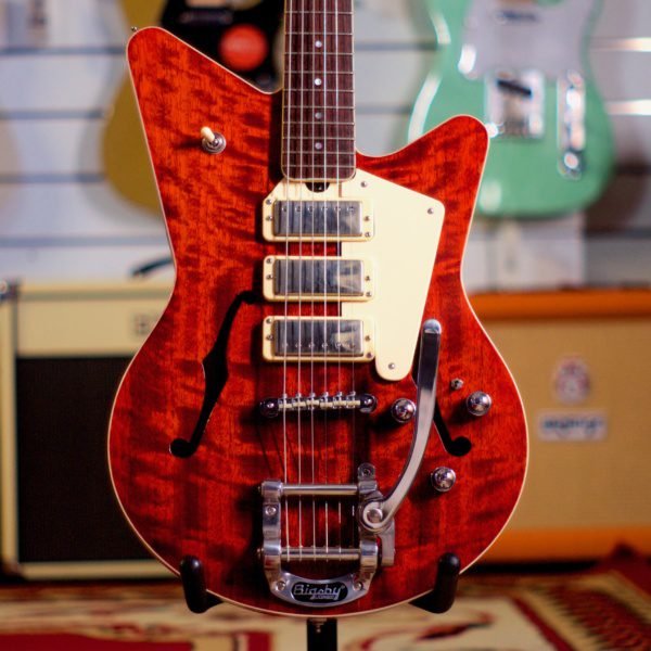 Handcrafted locally in Byron Bay, the Weave Asteria is a boutique semi-hollow electric guitar that combines stunning tonewoods with unique design and professional-grade playability. Built with a Narra top, Queensland Maple back, and Queensland Maple neck, it delivers warm resonance and a lively, dynamic response. Outfitted with Seymour Duncan mini humbuckers and a Bigsby tremolo, this guitar merges expressive playability with articulate, punchy tones. Its dual wiring system adds even more versatility—rhythm mode engages the neck and bridge pickups, while lead mode unlocks the middle pickup for a distinctive tonal palette. Complete with a fitted hardcase and strap, the Asteria stands as both a player’s dream and a showcase of exceptional local craftsmanship.